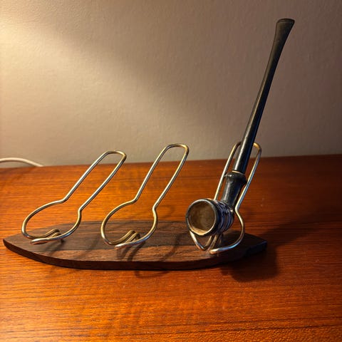 Selger pent brukt pipestativ med plass til 6 piper. Høyde ca. 18 cm. Pipene på bilde er for illustrasjon, men ta kontakt hvis du også er interessert i pipene.