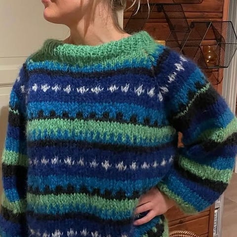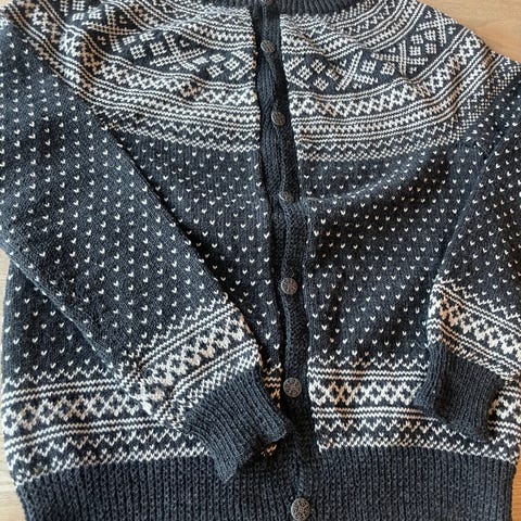Lengde 63 cm, overvidde 124 og ermelengde målt under armen 41 cm.