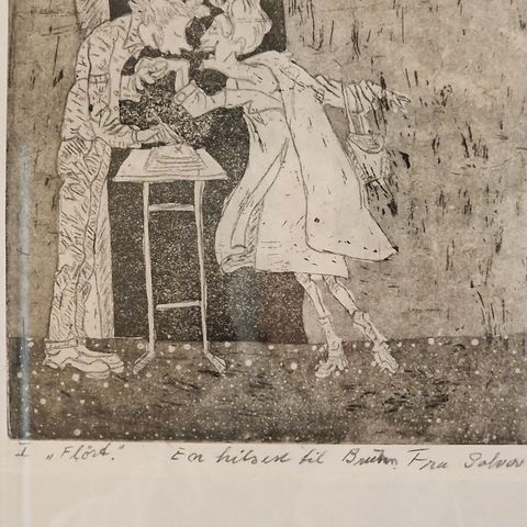 Skade på ramme i hjørner - se bilde. Litt gulnet - greier ikke å tyde kunstnerens navn. 41,5 x 48,5cm - selges for kr. 50 + frakt