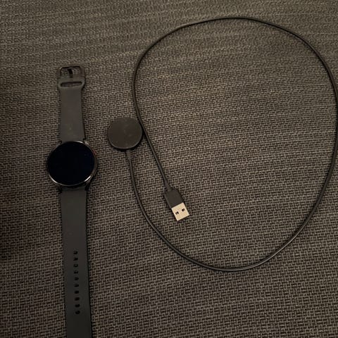 Samsung Galaxy Watch 5 pro smartklokke med svart reim. Inkluderer flere utskiftbare reimer i forskjellige materialer og farger. Skjermen har ingen riper eller skrammer og er blitt pent brukt. Et par slitemerker rundt kanten som vist på bildene.