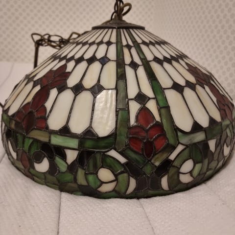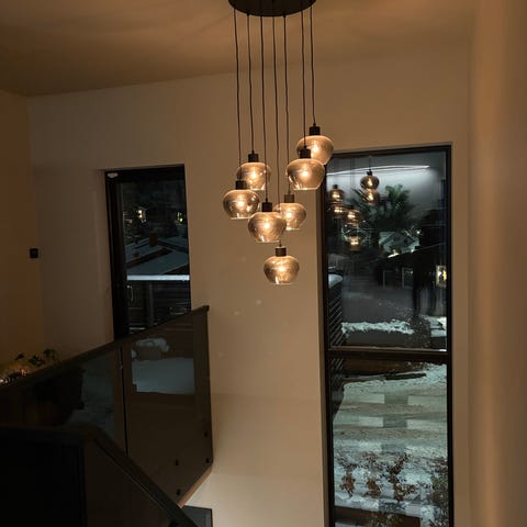 Stilig taklampe i kobber farge typ, flott effekt med dimmer. Henger i trappeløp her.