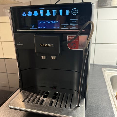 Miele CM 5100 frittstående kaffemaskin. Fungerer helt som den skal, og lager deilig kaffe. Maskinen har en kompakt design med en dryppskål og en melkeskummerfunksjon. Passer for hjemmebruk.