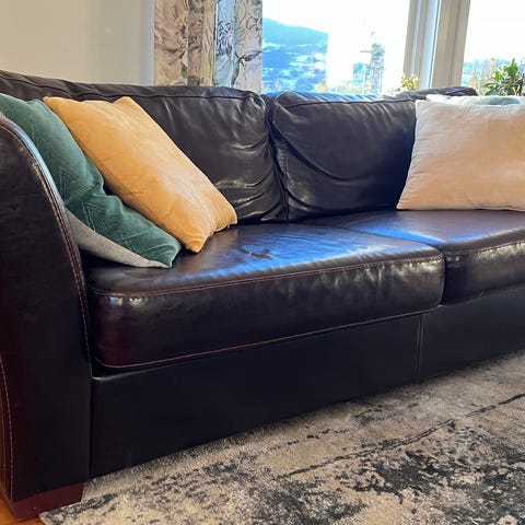 Vi har arvet den og gitt den nytt trekk fra uldvaren. Den trenger litt mere omsorg og har en del små mangler. Mangler blant annet pyntestifter til finerplaten i ryggen, og har en skade nederst på et ben, se bilde.