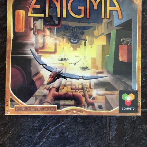 Completo Enigma brettspill med tidsur og brett i eske. Spillet inkluderer kort og brikker for flere spillere. Passer for bruk i sosiale sammenkomster og spillkvelder.