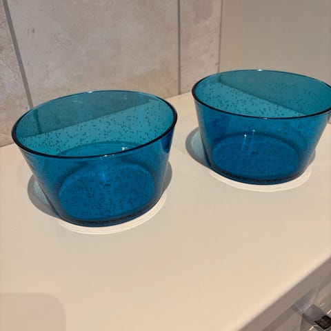 Flotte stetteskåler i hardplast med mønstret design. Passer til servering av desserter eller småretter. Kun brukt et par av dem en gang, ellers stått til pynt i skapet.
