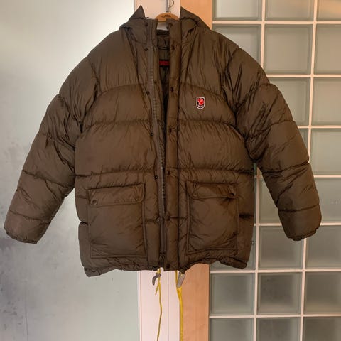 Fjällräven jakke i blå farge, størrelse S, laget av dun.
