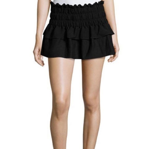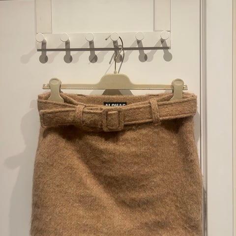 Skinnskjørt i imitert skinn. Asymmetrisk detalj foran, glidelås bak. Aldri brukt.