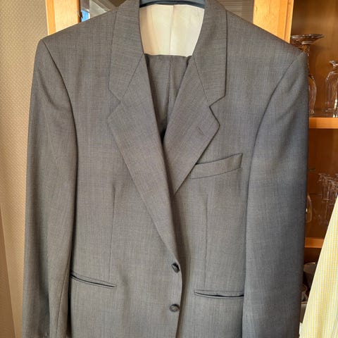 Skreddersydd blå dress. Midje til 52, skuldre ut mot 54