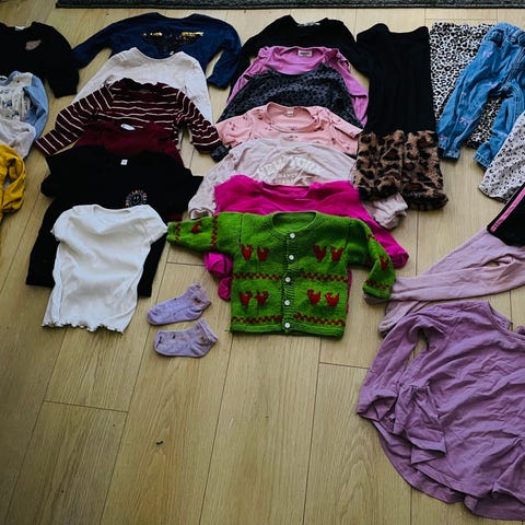 Grønn selekjole (47 cm lang målt med den øverste knappen) og en blomstret body med lange armer og rysjer (45 cm lang), og et par beige strømpebukser/tights, str 12-18 mnd (80/86). Kjøpt i England og er fra merket Fred & Flo. 100 % bomull. God kvalitet. Et flott antrekk til barnehagen og bursdagsselskap.
