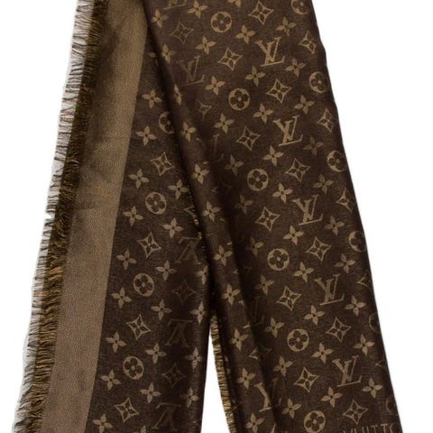 Skjerfet har et rutemønster og Louis Vuitton-logo påsydd.