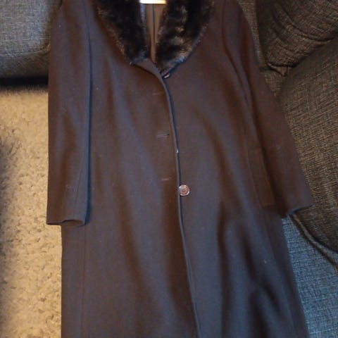 Jakken har lang lengde og er laget i et materiale som ikke er spesifisert, kr 200