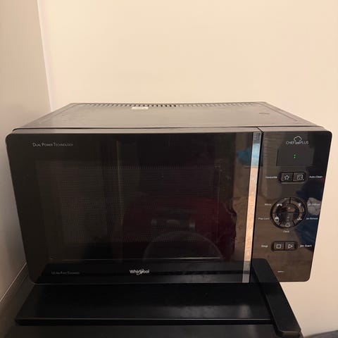 Whirlpool mikrobølgeovn i svart farge. Har flere funksjoner og innstillinger for tilberedning av mat. Innvendig hvit farge med glassplate.