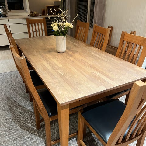 Spisebord med eikefinér og spisestoler (8 stoler) selges da vi har kjøpt ny spisegruppe.