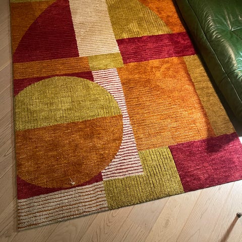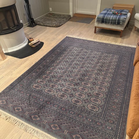 Generelt pent brukt. Teppet har noen små flekker, men ingen hull eller kraftig slitasje. Det selges grunnet endring i møblering.