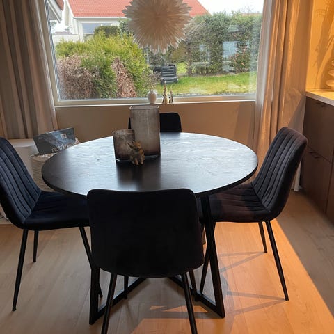 Selger dette pent brukte spisebordet og 4 spisestoler pga. skifter til noko større selv. Bordet har nokon skraper langs ytterkanten av bordflaten, se bilde. Spisestolene i god stand bare den ene som har blitt lappet med selvklebende stofflapp pga eit lite uhell, se bilde