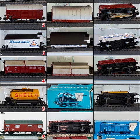 Flere godsvogner av ulike slag og med ulike grader av brukerspor. Alle er hele og i orden med mindre annet tydelig fremgår av beskrivelsen. Rabatt ved kjøp av fem eller flere på tvers av alle mine annonser. Pris pr. stk.