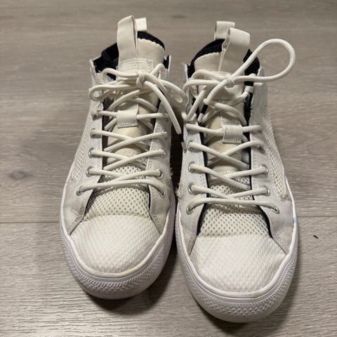 Converse sneakers joggesko i størrelse 40 med grønt stoffmateriale. Skoene har høyt skaft og hvite gummisåler med klassisk Converse-design. Egnet for daglig bruk.
