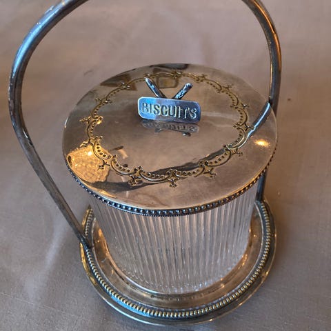Metall skrin med rose dekor . Buet lokk. Kr 0,45 pr hg er skrevet på innsiden av lokket. Litt skrev i lokket. Høyde 20 cm. Lengde 34 cm. Bredde 21.5 cm. Bærer preg av iallefall 75 års bruk.