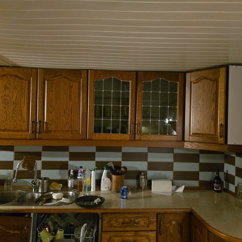 Kjøkkeninnredning med hvite skap og benkeplate i tre
