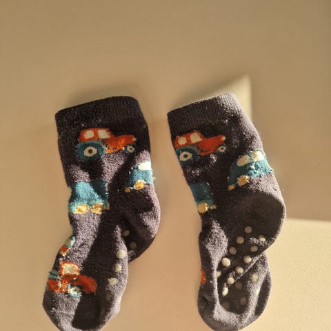 Blå sokker for barn i størrelse 104, designet for gutter. Sokker har antiskli på undersiden for bedre grep.