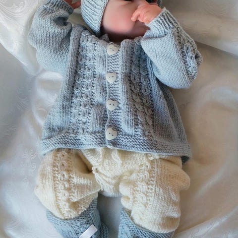 Nydelig strikket hentesett til nyfødt baby i ull.