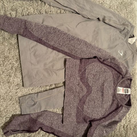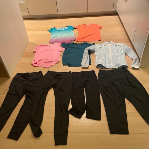 Pakke med treningsklær selges samlet. 4 t-skjorter, 2 bukser og 3 gensere (den ene er kort)