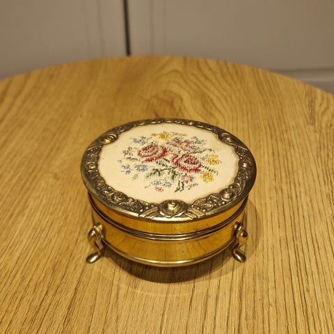 Vintage smykkeskrin, sjeldent fint ,kinesisk mahogni,med skjæremekanisme i messing,med jademedaljong på lokket,grønnblomstret fløyel på insiden,plass til ringer, ca 17x10cm, 8cm høy.