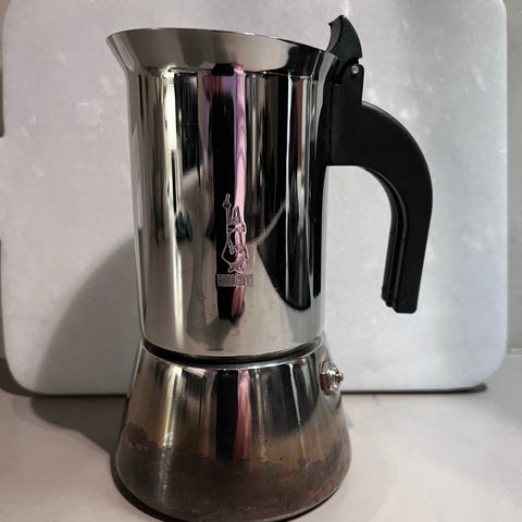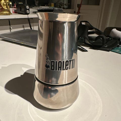 Dette er en tradisjonell italiensk mokkakanne i aluminium, også kjent som en espressokanne.