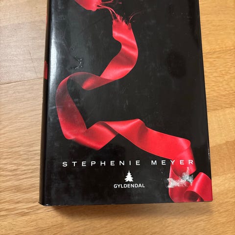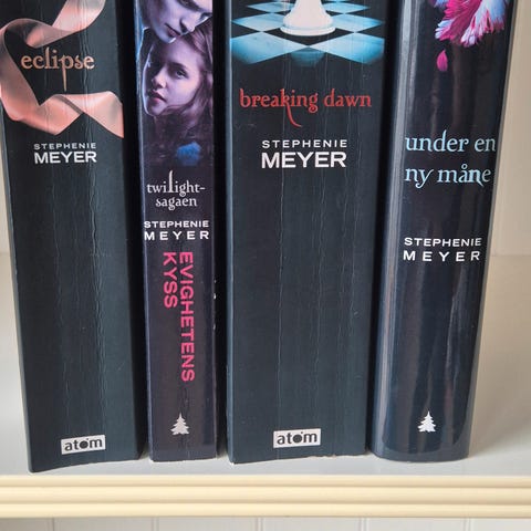 Stephenie Meyer Twilight-serie består av flere bøker utgitt av Gyldendal. Serien inkluderer titler som 'Under en ny måne', 'Formørkelsen' og 'Evighetens kyss'. Bøkene er innbundet og har omslag med karakteristiske bilder i farger som svart, rødt og hvitt.