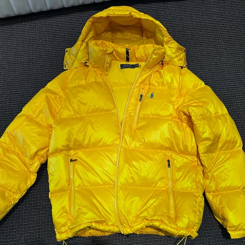 Ralph Lauren Polo dunjakke i blå farge, størrelse M. Jakken er laget av dun og er designet for menn. Den har glidelåslommer og hette, egnet for utendørs bruk i kaldt vær. Ingen synlige merker, men borrelåsen på armen fungerer litt dårlig