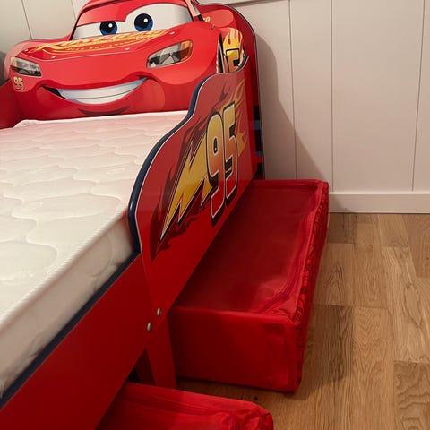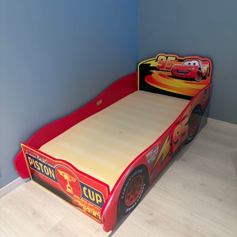 McQueen barneseng. Fine sengemål: 140x70 cm madrass, 170x75 cm bil. Sengen er i god stand, men viser tegn på slitasje. Madrassen er nyvasket. Pris: 1500 kr.