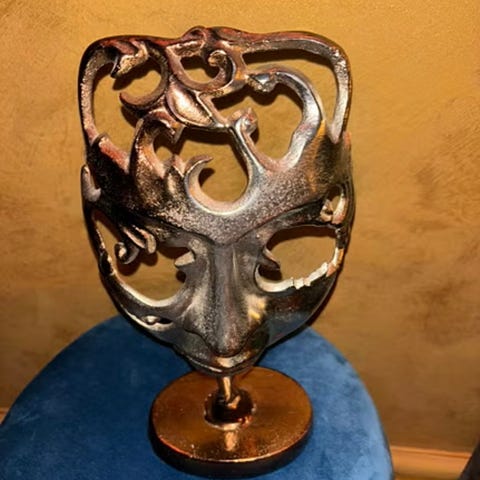 Dekorativ hodeskalle med en teksturert overflate og mørk bronsefarge. Egnet som dekorasjon i hjem eller kontor. Har 2 stk,selges helst sammen
