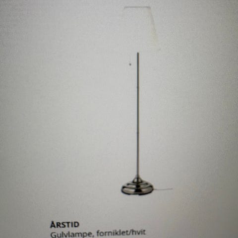 Stålampe fra Ikea med navn Årstid. Ingen synlige flekker eller bulker. Skjermen er hvit og fot og stang er i nikkel. Den er 150 cm høy.