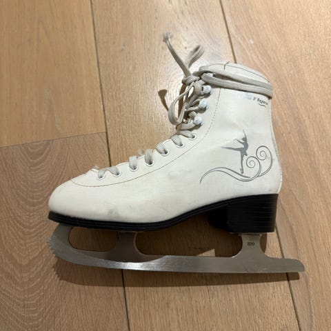 Pro flyer Hvit kunstløp skøyter barn str 32. Skøytene er hvite med snøring, designet for barn i størrelse 32. Litt liten i størrelsen.