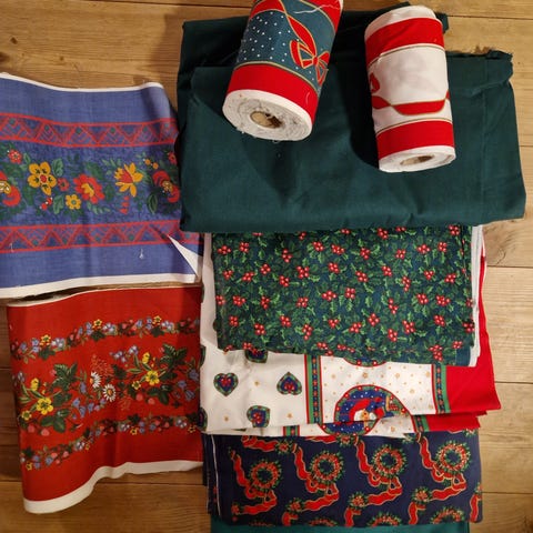 Flere juleløpere i ulike størrelser med broderte julemotiver og teksten "God Jul". Materiale i tynt Organza pluss et par løpere i Jute , farger varierer, men inkluderer hvit og beige bakgrunn med røde og grønne detaljer. Passer til dekorasjon i julen.