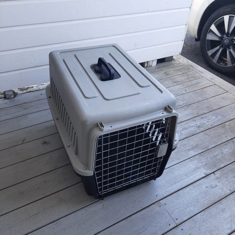 Transportbag med svart og hvitt stripemønster. Har nettingvinduer på sidene og bæreremmer. Har glidelås på toppen. Inneholder et mykt underlag. Blitt brukt men selger nå fordi katten min er for stor. Passer liten/medium katt eller liten hund.
