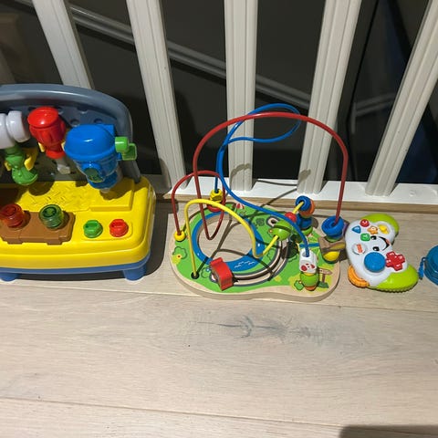 IKEA barn leketøy hammerbenk laget i tre. Inkluderer hammer og flere fargede pinner som kan slås gjennom benken. Egnet for små barn som leker og utvikler motoriske ferdigheter.