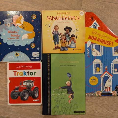 Selger unna litt bøker som ungene er vokst ifra. Her er det mye forskjellige bøker, men mye som er kjekt fra ca 2 - 7år.