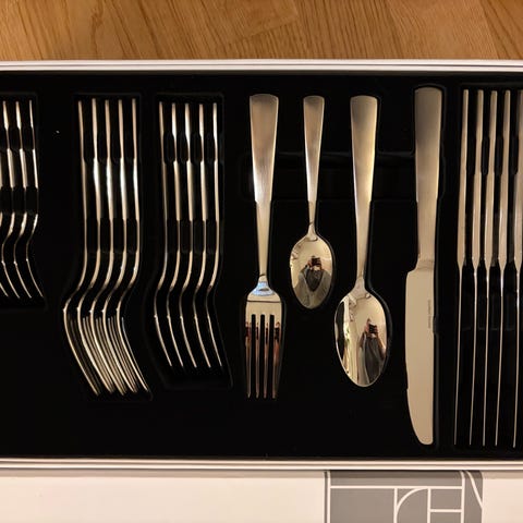 Ubrukt stålbestikk til 12 personer med tilhørende serveringsbestikk.