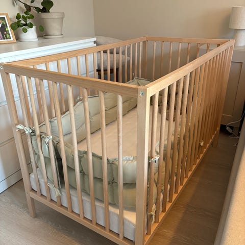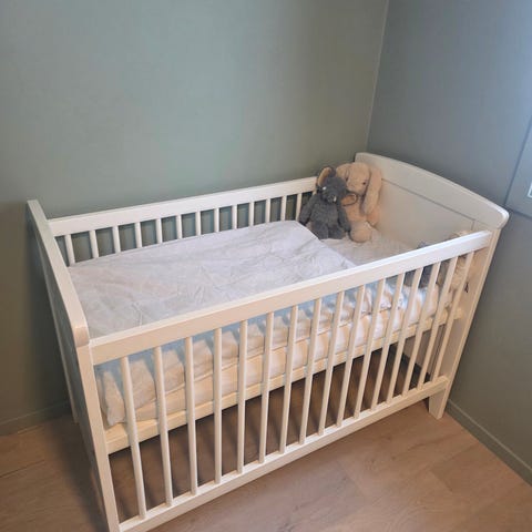Selges komplett med madrass, himmelseng, uro og sengekant. Har vuggefunksjon og man kan låse den så den ikke gynges. Brukt til 2 barn