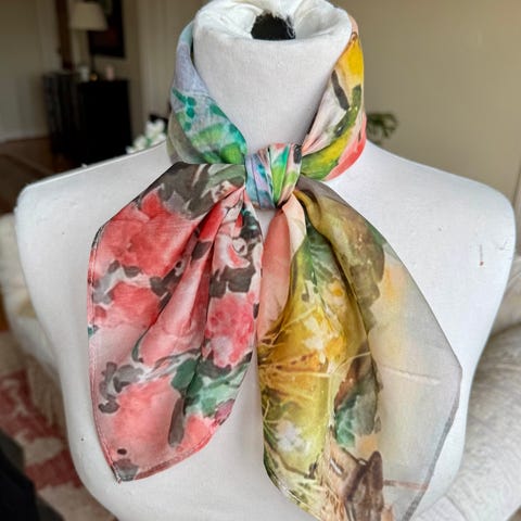 Vakkert silke/bomull skjerf. Flott kvalitet. Str.65x65cm