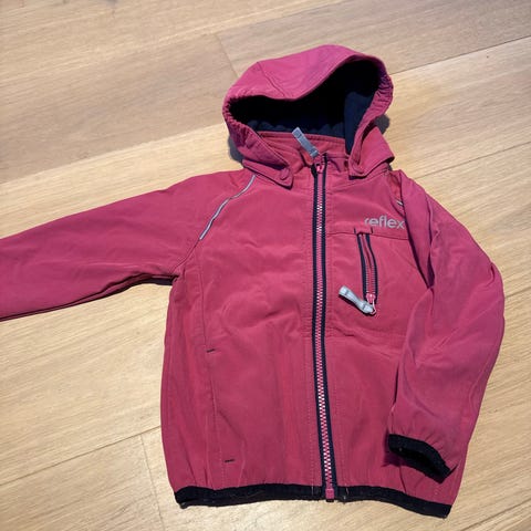 Reflex barnejakke i størrelse 92 for jente. Jakken er grå/lilla og laget av polyester. Den har hette og er designet for barn.