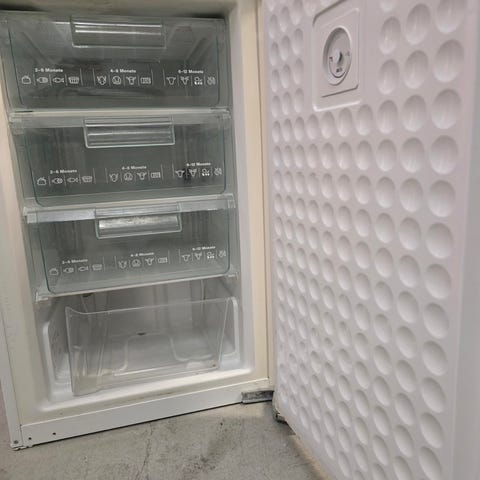 Siemens fryseskap med flere skuffer for oppbevaring av frosne varer. Enhet med hvit farge og manuell temperaturkontroll. Egnet for lagring av matvarer i hjemmet eller lignende miljøer.
