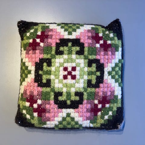 Nydelig håndlaget pyntepute med sjeldent vakkert håndbroderi.