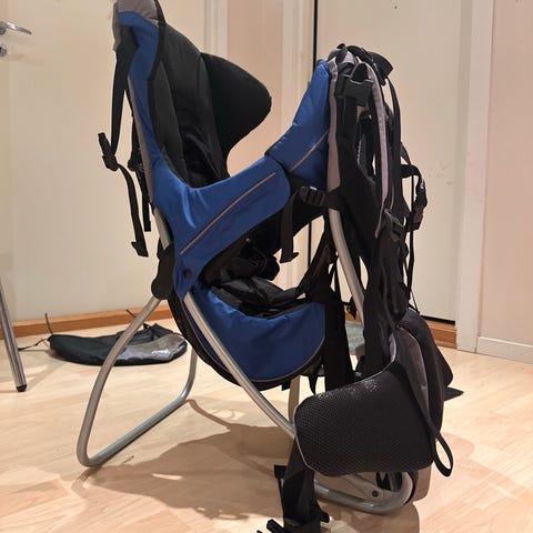 Pent brukt bæremeis. Det følger med «tak» for litt beskyttelse mot sol og vær. Sitter godt på ryggen. Støtte til barnes fot. Liten ryggsekk under barnet.