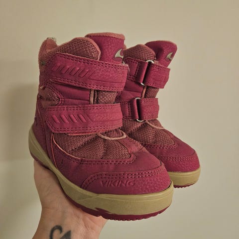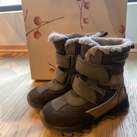 Den har bred passform. Brukt i maks 4 mnd. Brukt av ett barn. Farge er burgunder. Gode sko som holder føttene gode og varme.