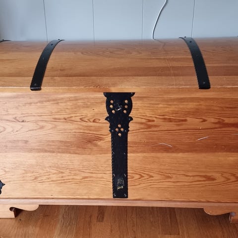 30 år gammel kiste, høyde 45cm, lengde 75cm, bredde 43 cm. Noe pussemerker på fremsiden og innsiden pga.fjerning av tekst. Kan hentes I 4 etg. I Klasatjønnveien. Må bæres ned av de som henter.