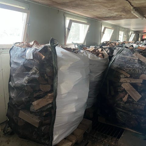 Tørr bjørkeved og granved selges i 1000 l sekker.