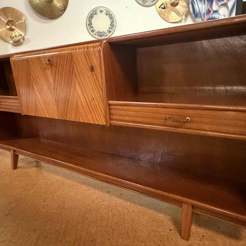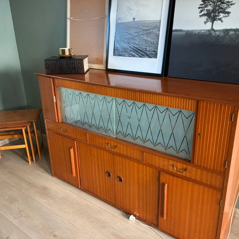 Selger en nydelig og sjarmerende retro skjenk i teak. Opprinnelig er den et platespiller-kabinett, men jeg har brukt den som vanlig skjenk og til oppbevaring. Skjenken har to rom, og i det ene er det en hylleplate som kommer litt frem når man åpner døren. I begge rommene er det hull, slik at man kan ha ledning ut (feks til platespiller). I tillegg er det to skuffer over de to rommene hvor man kan ha mindre ting.