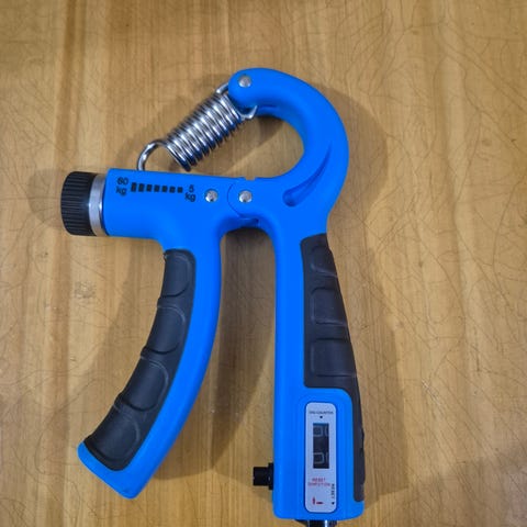 Grepstrener med justerbar motstand. Håndgrepet er utstyrt med fjær og en rød justeringsskrue for å tilpasse motstanden etter behov. Egnet for styrking av hånd- og underarmsmuskulatur.